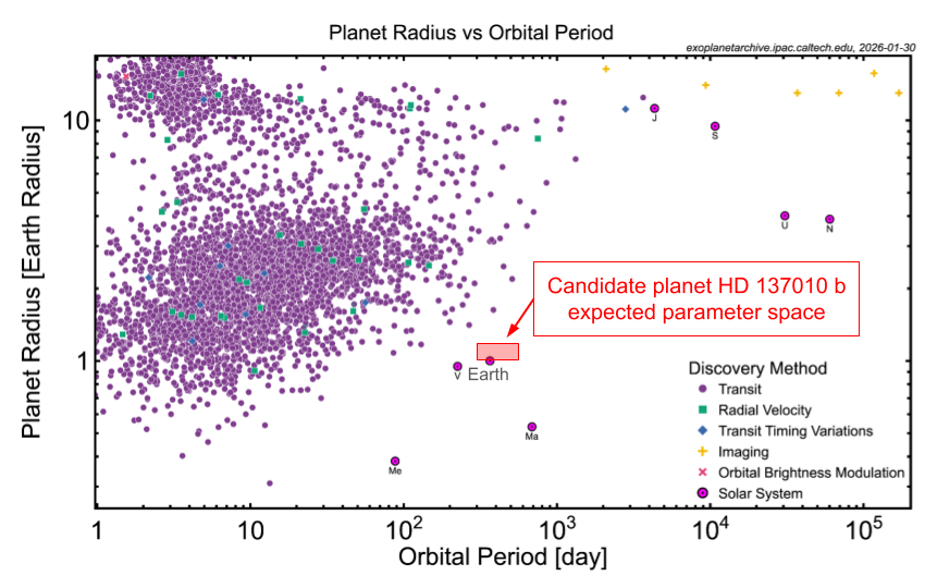 The following data plot shows how HD 137010 b may occupy a region of orbital period and radius space similar to Earth's: